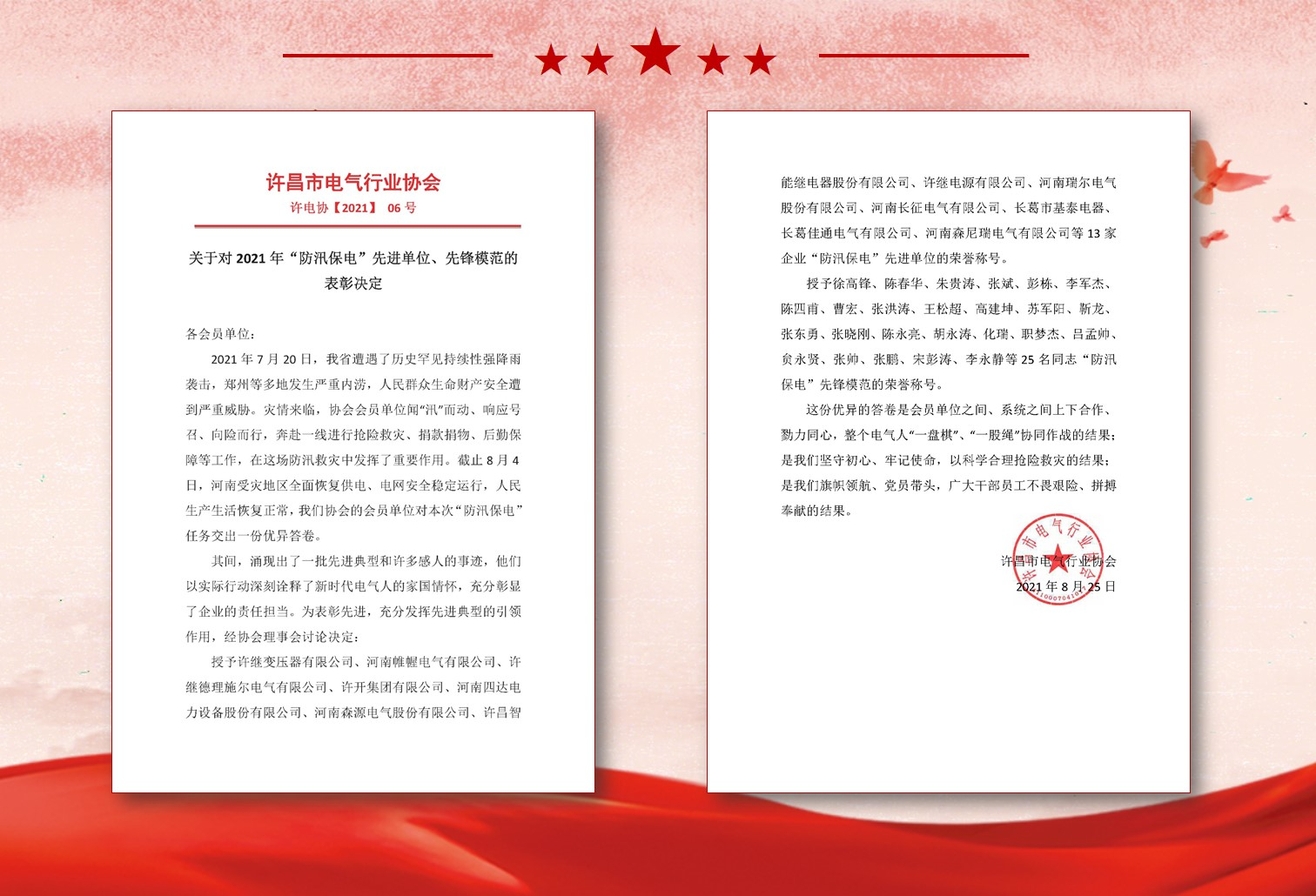 9月26日下午,許昌市電氣行業(yè)協(xié)會召開了2021年“防汛保電”、先鋒模范表彰大會,會議由協(xié)會副會長兼秘書長張新萍主持,會上許昌市工信局副局長張晨武宣讀了《關(guān)于對2021年“防汛保電”先進(jìn)單位、先鋒模范的表彰決定》,許昌智能被授予2021年河南特大暴雨“防汛保電”先進(jìn)單位,公司董事長榮獲“先鋒模范”稱號。