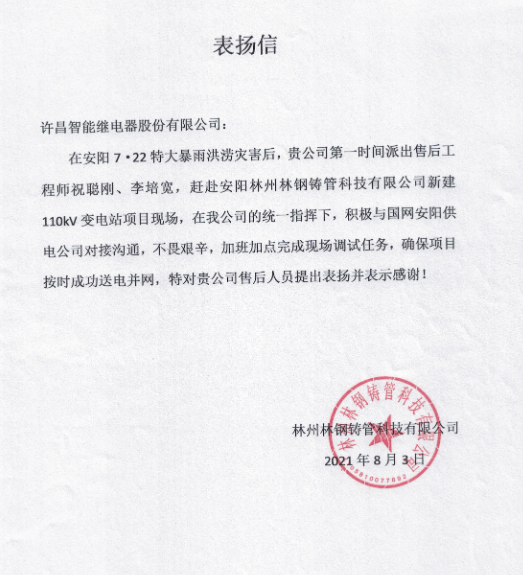為客戶提供最滿意的服務(wù),是許昌智能的企業(yè)宗旨,安陽林州重機(jī)林鋼鋼鐵110kV智能配電系統(tǒng)的成功投運(yùn),是許昌智能人對(duì)這一企業(yè)宗旨的又一次踐行。