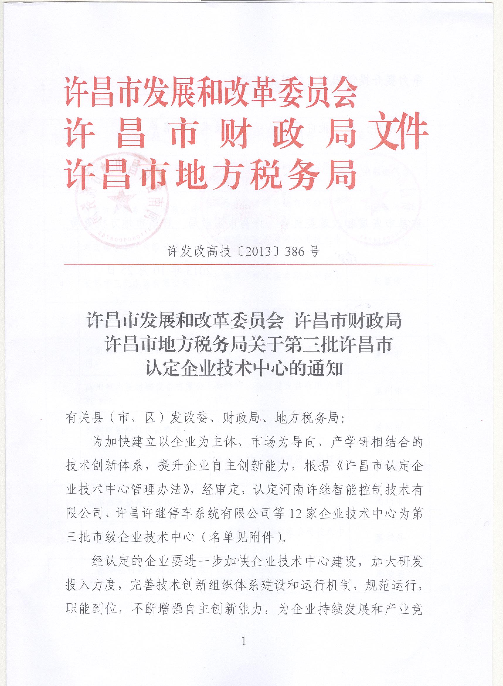 為提高企業(yè)技術(shù)創(chuàng)新能力,充分發(fā)揮企業(yè)技術(shù)中心在許昌市創(chuàng)新體系和企業(yè)創(chuàng)新能力建設中的引導與示范作用,“河南許繼智能控制技術(shù)有限公司企業(yè)技術(shù)中心”首個通過了許昌市發(fā)展和改革委員會、許昌市財政局、許昌市地方稅務局聯(lián)合開展的企業(yè)技術(shù)中心認定。