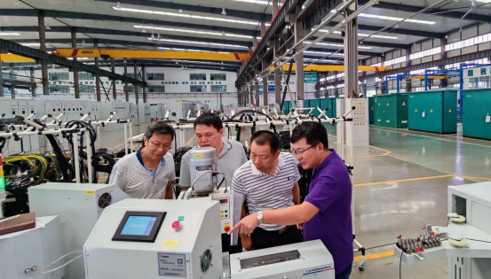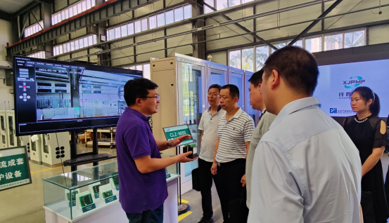 在董事長的陪同下,工作組一行深入公司生產(chǎn)車間,全面了解正在生產(chǎn)的城市軌道直流牽引供電成套設備、低壓環(huán)控柜、智能變配電系統(tǒng)、配網(wǎng)自動化一二次融合設備、充電樁、光儲充一體化系統(tǒng)、數(shù)據(jù)中心供電解決方案等產(chǎn)品,并仔細詢問了公司生產(chǎn)經(jīng)營情況和需要協(xié)調(diào)解決的問題,隨后雙方在科研辦公樓會議室展開交流。