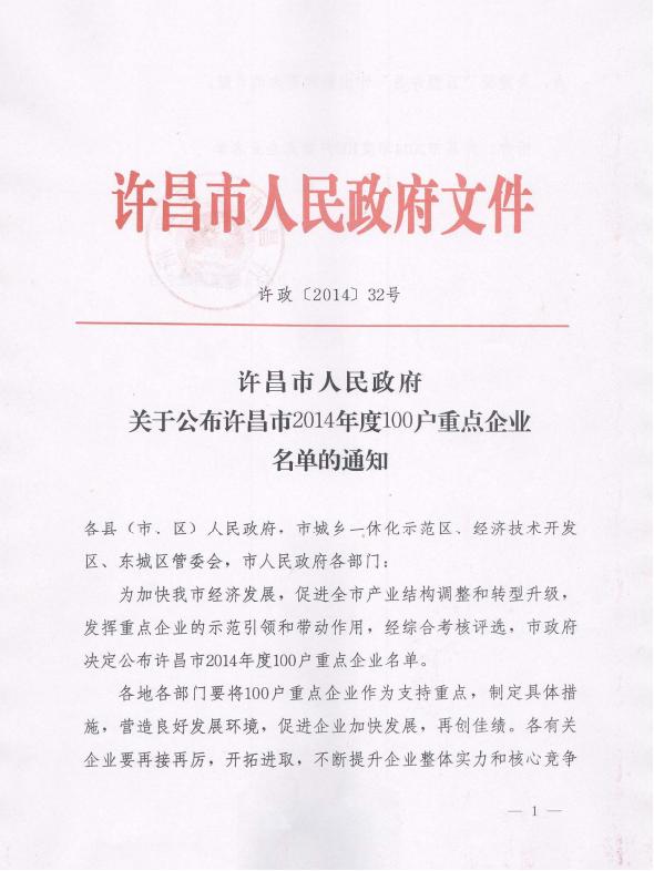 許政[2014]32號(hào)許昌市人民政府關(guān)于公布許昌市2014年度100戶重點(diǎn)企業(yè)名單的通知