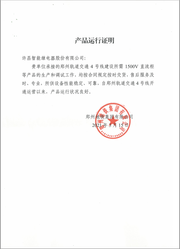 3月15日,許昌智能收到客戶發(fā)出的鄭州地鐵4號線直流柜產(chǎn)品運(yùn)行證明,標(biāo)志著公司KED系列牽引供電直流成套開關(guān)設(shè)備在地鐵領(lǐng)域更大范圍內(nèi)得到應(yīng)用和推廣。