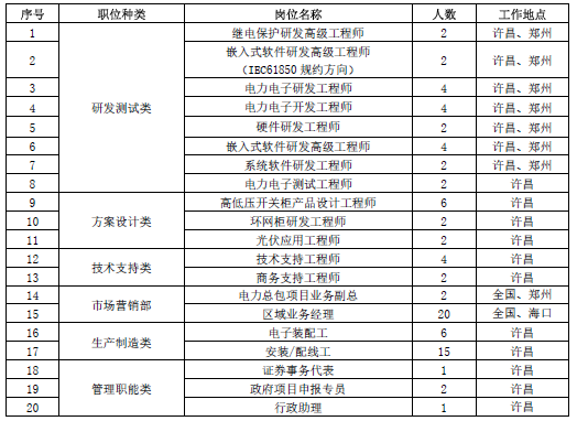 公司現(xiàn)有員工400人,以技術(shù)開發(fā)、營銷服務(wù)為主體的人才倒三角結(jié)構(gòu)組成,組建有五大實(shí)驗(yàn)室支撐研發(fā)體系,分別為變配電系統(tǒng)測試實(shí)驗(yàn)室、嵌入式軟件測試實(shí)驗(yàn)室、硬件抗干擾實(shí)驗(yàn)室、雷電沖擊實(shí)驗(yàn)室及局放實(shí)驗(yàn)室,公司被認(rèn)定為省級企業(yè)技術(shù)中心、省級工程技術(shù)研究中心、國家發(fā)改委開放式研發(fā)平臺。本次招聘以??诠窘M建、鄭州工程技術(shù)中心、許昌三地為主: