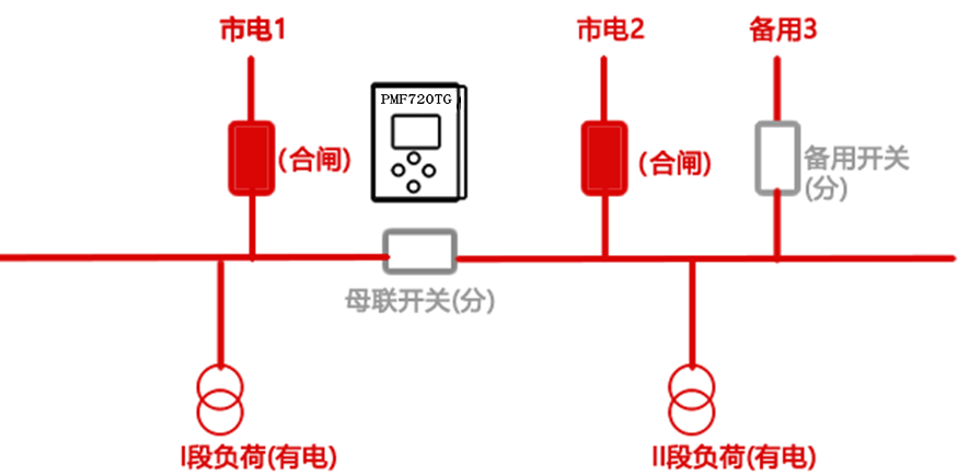 1、正常情況下:I段負荷由市電1供電,II段進線由市電2供電,備用電源3斷開。