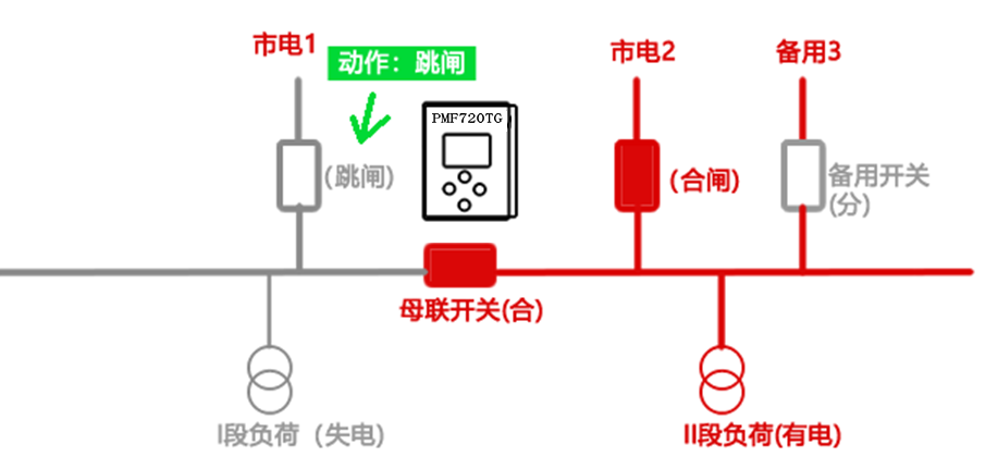 2、市電1失電:備自投裝置檢測到I母線失電,先控制市電1斷路器跳閘。