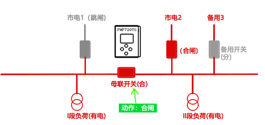 3、備用電源投入:市電1斷路器跳開后,控制備母聯(lián)開關合閘,恢復I段負荷供電。