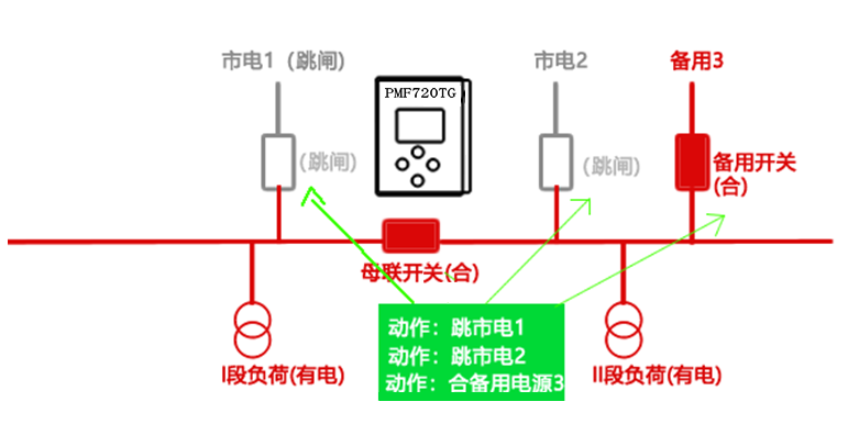 4、在市電1和市電2都失電情況下,由備用電源3供電:備自投自動跳開市電1、市電2的電源開關,利用“甩負荷跳3DL”控制字來選擇是否合或者跳母聯(lián)開關(這里是選擇合母聯(lián)開關),當市電1、市電2斷路器跳開后,同時母聯(lián)開關位置為合位,備自投自動控制備用電源3進線開關合,恢復 I段負荷和II負荷供電。