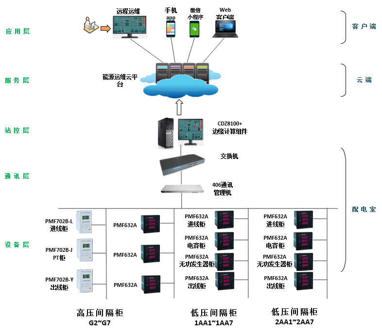 系統(tǒng)整體采用分層的架構(gòu)模式,主要分為設(shè)備采集層、數(shù)據(jù)通訊層、站控操作層、云服務(wù)層及應(yīng)用層等?,F(xiàn)場(chǎng)保護(hù)及測(cè)量裝置對(duì)本地?cái)?shù)據(jù)進(jìn)行采集,通過(guò)PMF406通訊管理機(jī)進(jìn)行規(guī)約轉(zhuǎn)換;通訊管理機(jī)經(jīng)交換機(jī)將數(shù)據(jù)上傳至本地后臺(tái)系統(tǒng),實(shí)現(xiàn)本地系統(tǒng)監(jiān)控;后臺(tái)系統(tǒng)由邊緣計(jì)算組件通過(guò)寬帶網(wǎng)絡(luò)將數(shù)據(jù)遠(yuǎn)傳至云平臺(tái)服務(wù)器,實(shí)現(xiàn)手機(jī)App、微信小程序和Web網(wǎng)頁(yè)遠(yuǎn)程訪問(wèn)等功能。其整體網(wǎng)絡(luò)架構(gòu)如下圖所示。