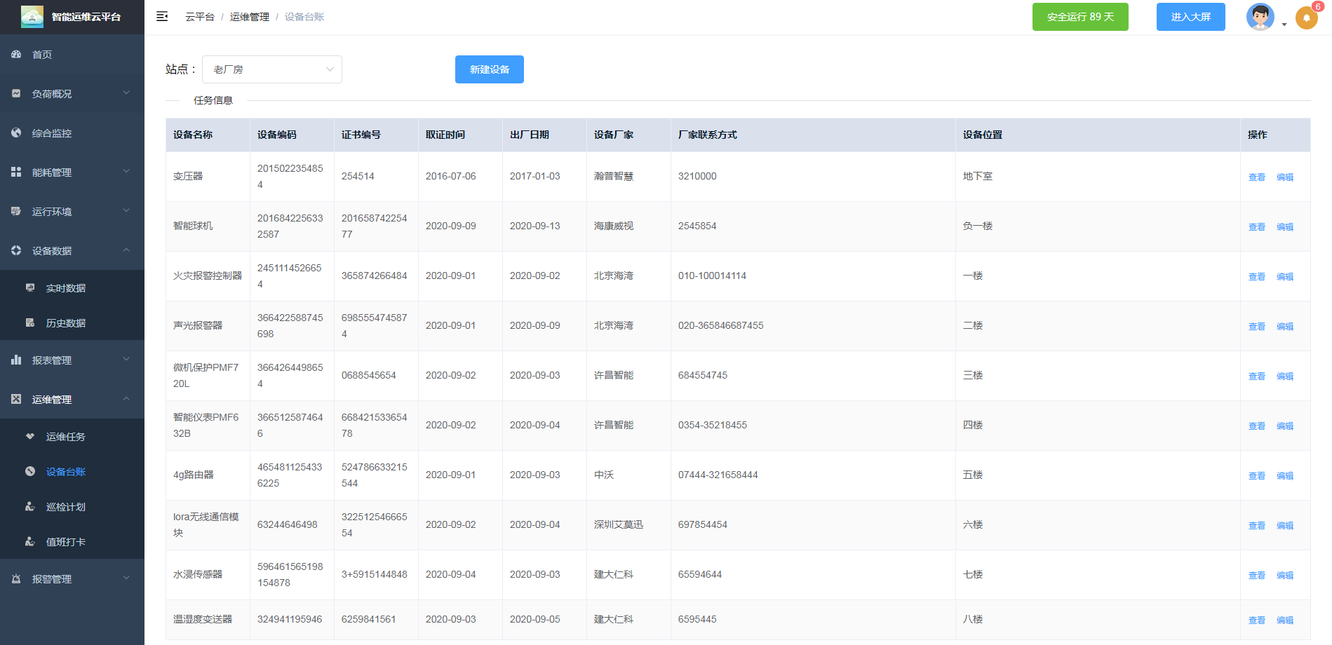 系統(tǒng)可配置每個變電所內(nèi)變壓器、進線柜、出線柜、計量柜、高壓電纜等設(shè)備信息,記錄設(shè)備的廠家、型號、投運日期等,并可通過報表統(tǒng)計近期需要保養(yǎng)或更換的設(shè)備。