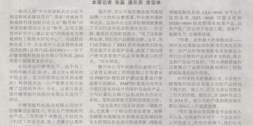 成功入圍“中央國家機關(guān)辦公區(qū)節(jié)能監(jiān)管體系建設(shè)項目”、榮獲“河南省節(jié)能減排科技創(chuàng)新示范企業(yè)”稱號和“河南省創(chuàng)新型試點企業(yè)”稱號、公司工程技術(shù)研究中心被認定為“河南省電力智能測控工程技術(shù)研究中心”、完成股份制改造工作、在全國中小企業(yè)股轉(zhuǎn)系統(tǒng)成功掛牌(證券代碼:831396)……對于許繼智能科技股份有限公司來說,2014年是個碩果累累的年份。