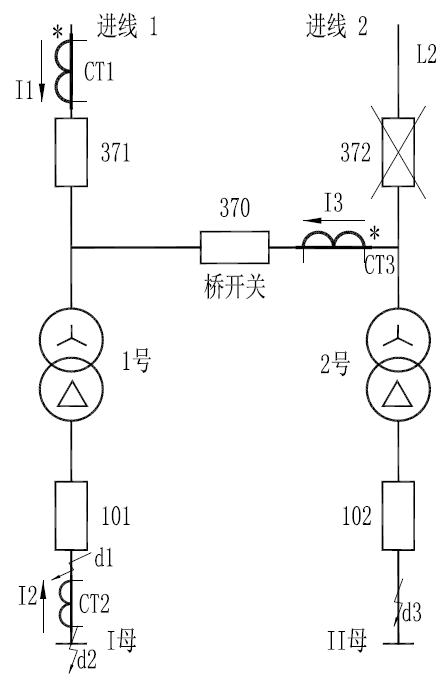 2) 當只有一條進線運行,另一條進線備用,內(nèi)橋開關在合位。以對1號主變差動保護動作情況為例進行分析: