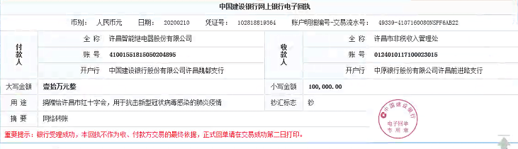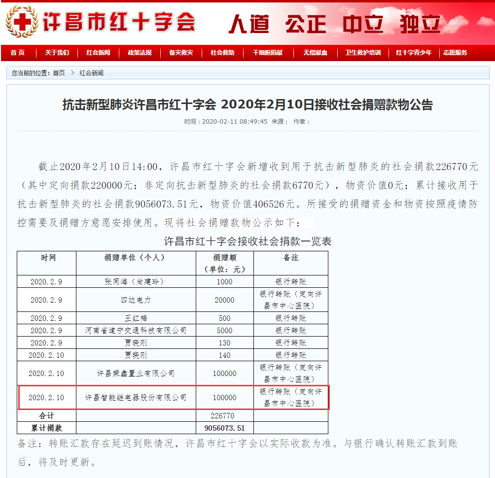 2020年2月10日,許昌智能繼電器股份有限公司向許昌市紅十字會(huì)定向捐贈(zèng)了第一批現(xiàn)金壹拾萬元整用于許昌市中心醫(yī)院抗擊疫情。