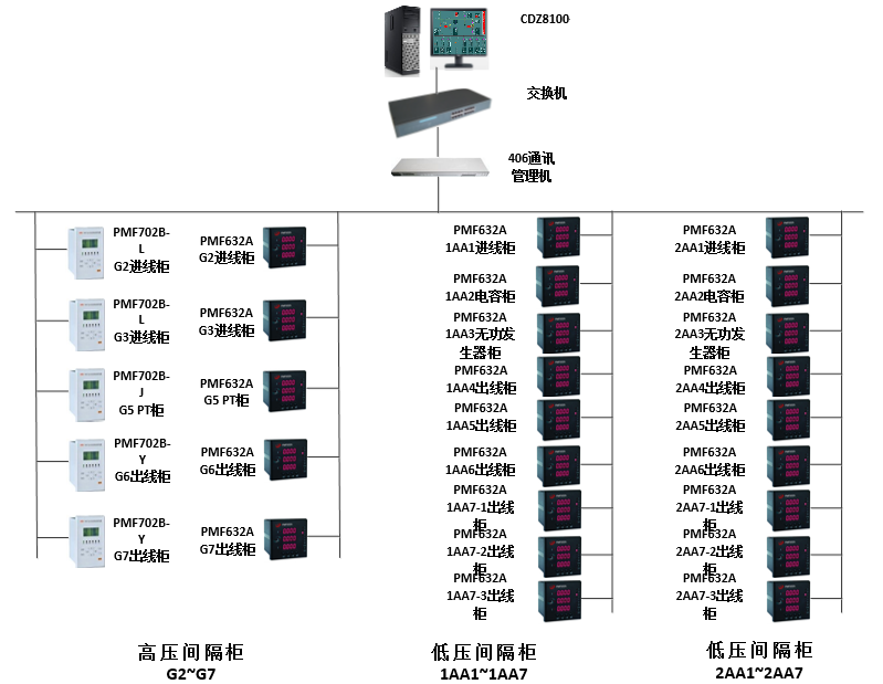 本項目包含遠動通訊箱2面、監(jiān)控主站工作臺1套(含光纖收發(fā)器)(會展中心及酒店配電室)、22臺PMF702B系列微機保護、外設直流屏1套、外設多功能表430只,均接入監(jiān)控系統(tǒng)。