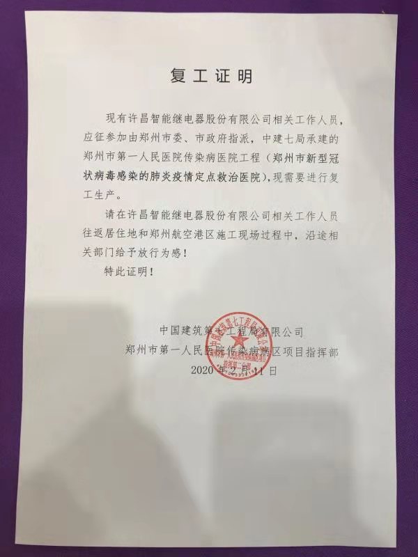 2月11日,許昌智能應(yīng)征援建由鄭州市委、市政府指派的鄭州市第一人民醫(yī)院傳染病醫(yī)院工程(鄭州市新型冠狀病毒感染的肺炎疫情定點(diǎn)救治醫(yī)院)。鄭州“小湯山”工程時(shí)間緊、任務(wù)重,為更好完成“戰(zhàn)疫”,許昌智能防控小組以“早動(dòng)手、細(xì)規(guī)范、上裝備、定措施”為原則,以企業(yè)安全復(fù)工為目標(biāo),嚴(yán)格按照示范區(qū)企業(yè)復(fù)產(chǎn)審批的各項(xiàng)要求提交復(fù)工申請(qǐng)并做好防疫準(zhǔn)備。經(jīng)許昌市城鄉(xiāng)一體化示范區(qū)工業(yè)企業(yè)聯(lián)合審核工作小組對(duì)公司復(fù)工申請(qǐng)材料的審查及現(xiàn)場(chǎng)審核,于2月12日向公司發(fā)放正式復(fù)產(chǎn)通知書(shū)。