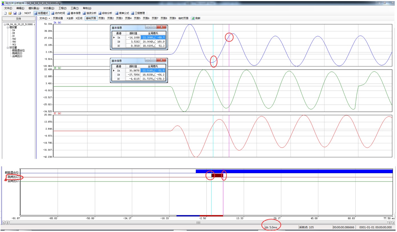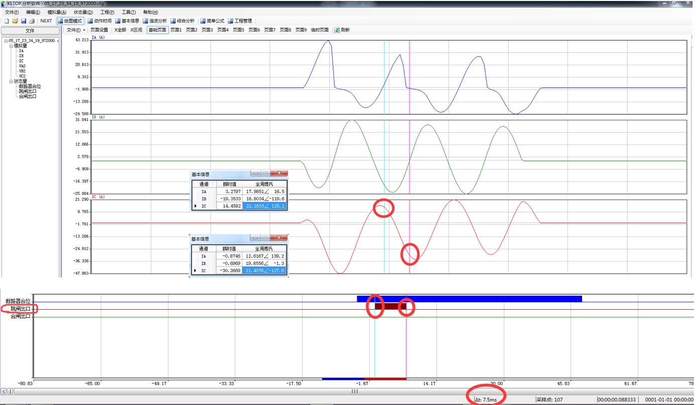 某次保護(hù)裝置報(bào)過流I段保護(hù)動(dòng)作、斷路器跳開的故障錄波如圖3所示,其過程與圖2相同;但圖3保護(hù)跳閘繼電器BTJB閉合的時(shí)間為7.5ms。