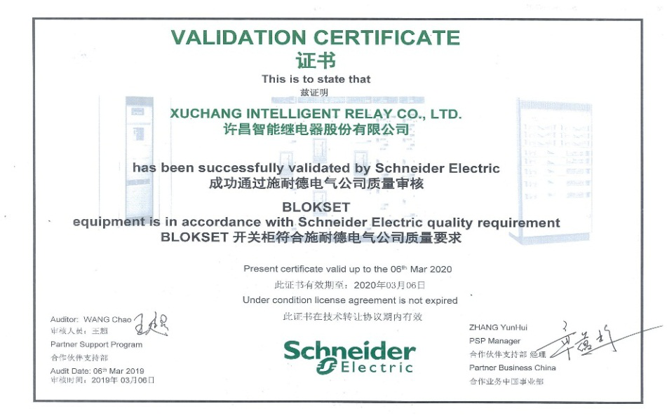 許昌智能與施耐德電氣(中國(guó))有限公司達(dá)成合作協(xié)議,許昌智能公司作為施耐德電氣的緊密合作伙伴,獲得施耐德電氣Blokset開(kāi)關(guān)柜產(chǎn)品生產(chǎn)授權(quán),并于2019年3月成功通過(guò)施耐德電氣公司質(zhì)量審核。