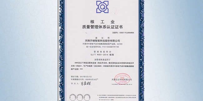 3月17日,公司通過(guò)核工業(yè)質(zhì)量管理體系EJ/T9001-2014標(biāo)準(zhǔn)認(rèn)證,取得認(rèn)證證書。