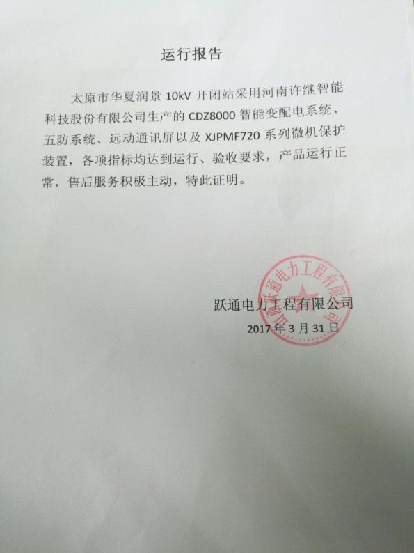 在該項(xiàng)目開(kāi)閉所調(diào)試期間,我公司售后人員響應(yīng)迅速、服務(wù)熱情,站內(nèi)調(diào)試時(shí)耐心指導(dǎo)施工方排除接線故障并認(rèn)真對(duì)用戶(hù)進(jìn)行了培訓(xùn),并主動(dòng)幫助調(diào)度排除通道故障。送電圓滿(mǎn)結(jié)束后,用戶(hù)表示對(duì)我公司設(shè)備和售后服務(wù)非常滿(mǎn)意,開(kāi)具了運(yùn)行報(bào)告和表?yè)P(yáng)信。(文末附運(yùn)行報(bào)告、表?yè)P(yáng)信)