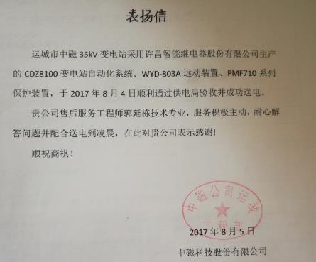 許昌智能堅(jiān)持“為客戶提供最滿意的服務(wù)”的企業(yè)宗旨,在變電站調(diào)試期間,公司售后服務(wù)人員響應(yīng)迅速、服務(wù)熱情,以精湛的技術(shù)和優(yōu)質(zhì)的服務(wù)順利完成變電站的調(diào)試工作,助力變電站順利通過(guò)供電局送電驗(yàn)收。