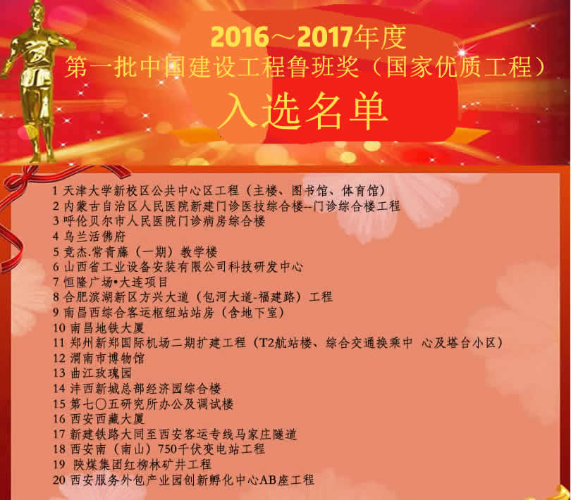 根據(jù)“2016~2017年度中國建設(shè)工程魯班獎(國家優(yōu)質(zhì)工程)”第一批入選工程評選結(jié)果,繼南昌地鐵大廈和南昌西綜合客運樞紐站站房項目之后,公司參與的其他18個工程同時榮膺“魯班獎”。至此,公司累計獲得20項“魯班獎”,成為中國電氣行業(yè)內(nèi)一張靚麗的名片。