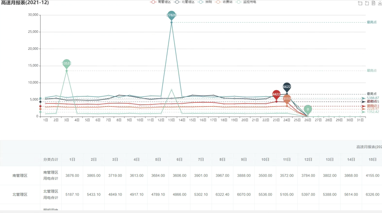 高速沿線39個箱變,根據(jù)箱變內(nèi)設(shè)備用電類型不同制作定制化曲線,支持用戶按照不同的用電類別分類統(tǒng)計匯總展示用電年、月、日曲線數(shù)據(jù)。