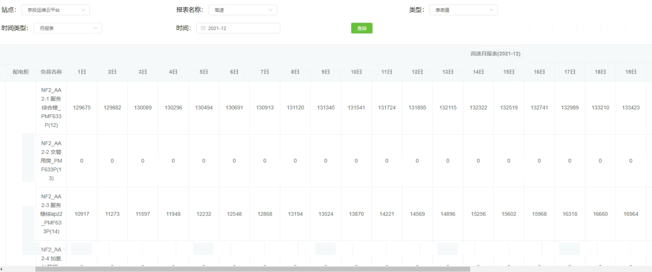 高速沿線39個箱變,根據(jù)箱變內(nèi)設(shè)備用電類型不同制作定制化報表,支持用戶按照不同的用電類別,分類統(tǒng)計匯總展示用電年、月、日表底值、增量值報表數(shù)據(jù)展示并導(dǎo)出Excel表格。