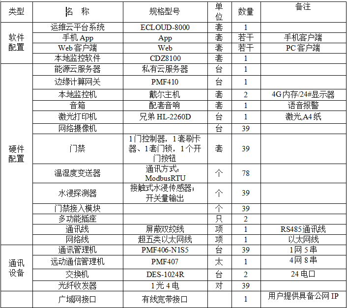 根據(jù)上述用戶需求及網(wǎng)絡(luò)架構(gòu)方案,北京新機(jī)場ECLOUD-8000能源運(yùn)維云平臺的主要軟硬件配置如下表所示。