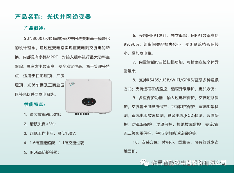 為適應(yīng)國(guó)家新能源轉(zhuǎn)型,公司推出光伏并網(wǎng)逆變器、并網(wǎng)箱、匯流箱、防孤島保護(hù)裝置、電能質(zhì)量在線(xiàn)監(jiān)測(cè)及治理裝置、儲(chǔ)能成套設(shè)備等新能源產(chǎn)品,并提供發(fā)電側(cè)-電網(wǎng)側(cè)-用戶(hù)側(cè)儲(chǔ)能解決方案、縣域光伏整體開(kāi)發(fā)方案、低碳智慧園區(qū)解決方案等,助力國(guó)家“碳達(dá)峰-碳中和”目標(biāo)的實(shí)現(xiàn)。